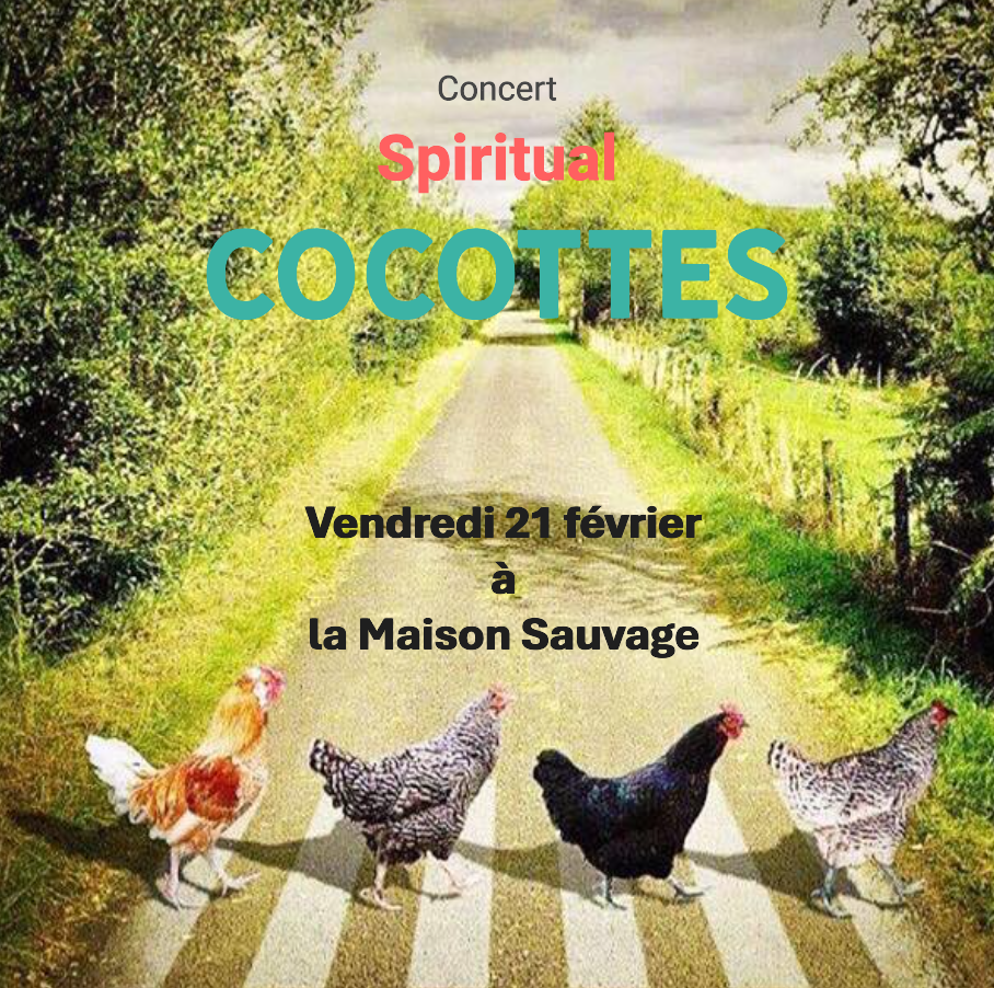 Concert des Spiritual Cocottes Vendredi 21 février à 19h30 Non d’une plume : À tous les mous de la glotte, les cocottes ne sont pas des poules mouillées ! Du haut de leur crête elles sauront vous emporter avec elles : vous vous sentirez pousser des ailes ! Reprises en tout genre version gallinacés ^^...