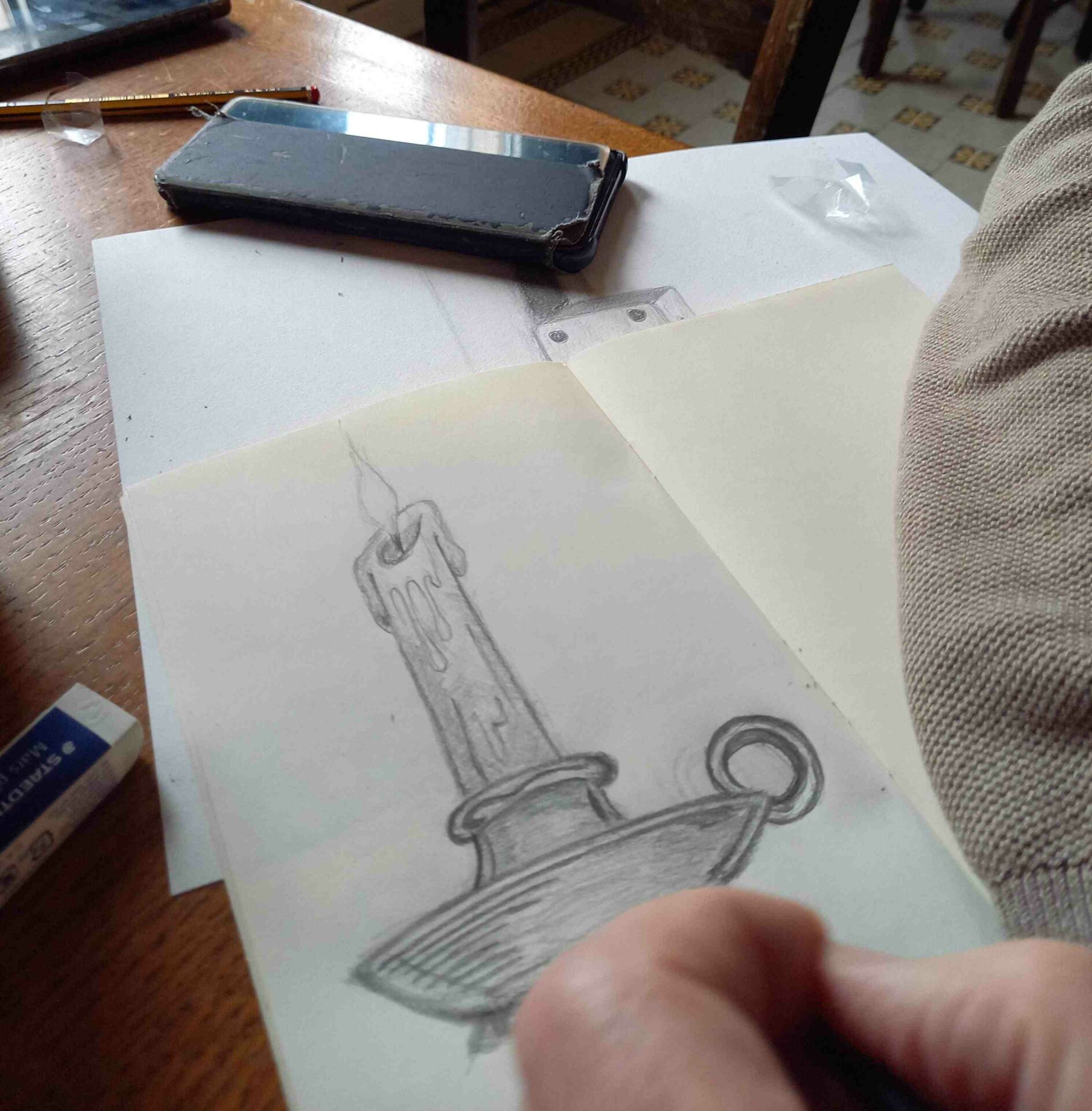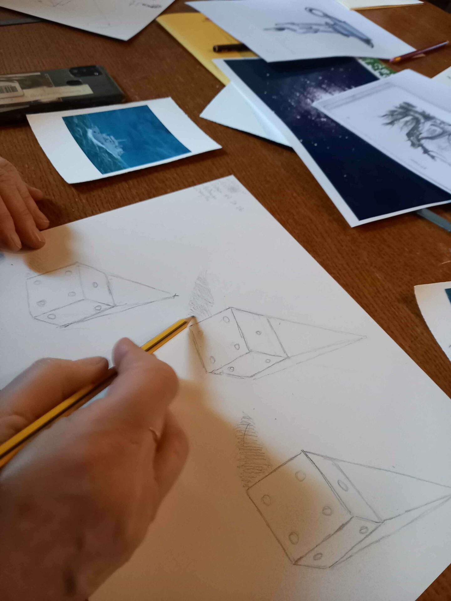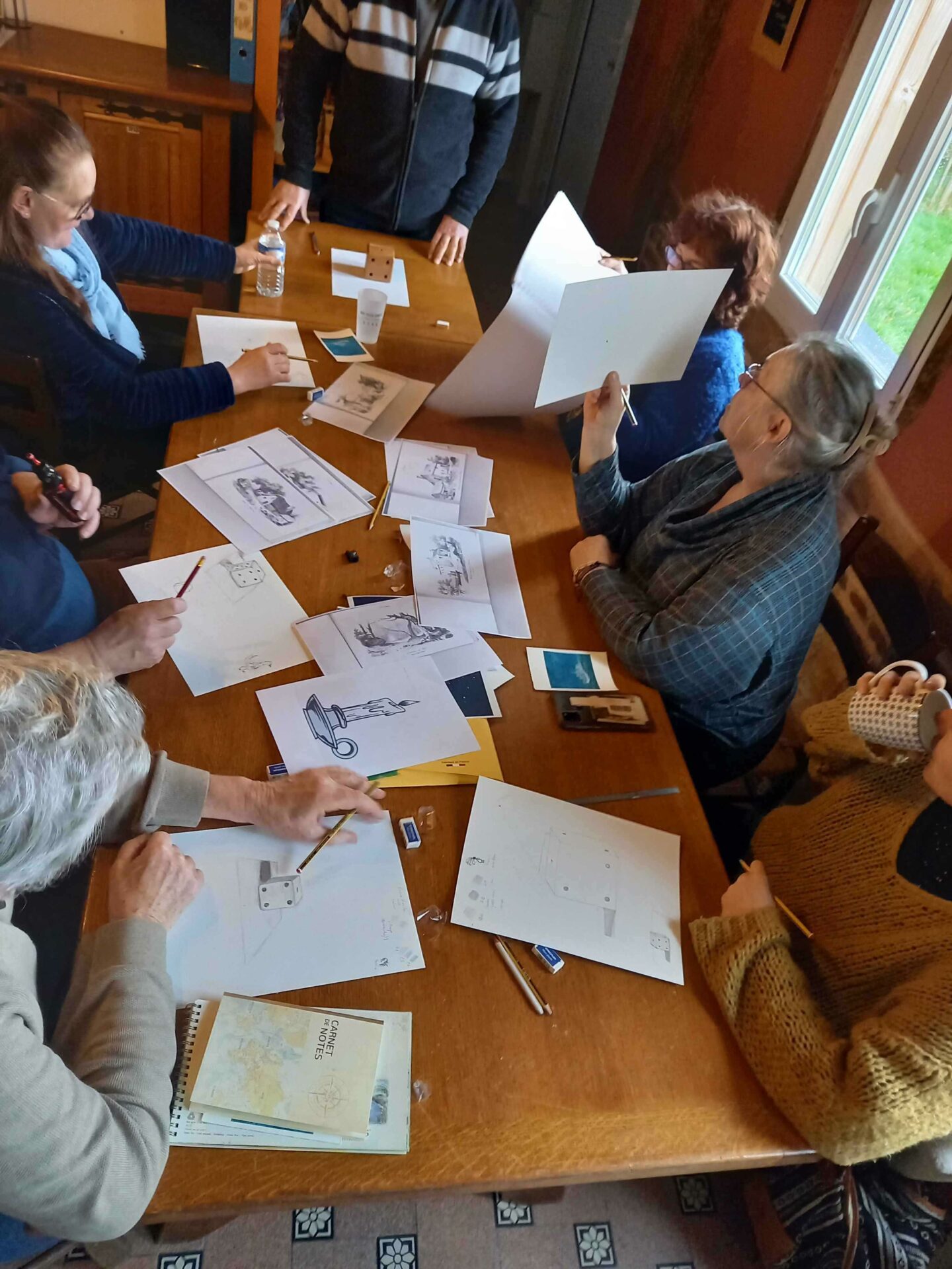 Première séance dessin ce matin ! Patrick Bigeon a mené 1 groupe de 6 artistes en herbe qui a pu s’exercer sur la perspective et les ombres d’un dé