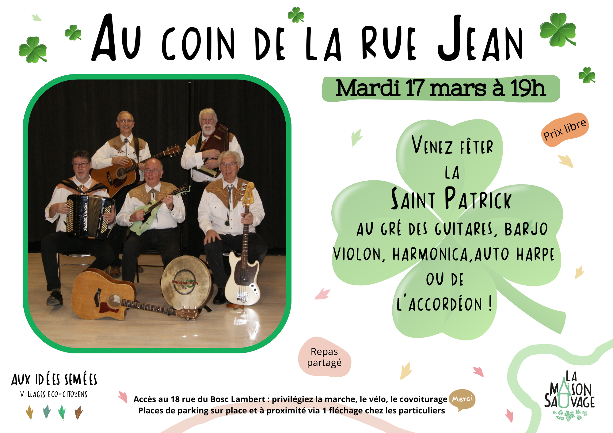C’est la Saint Patrick ! Et nous vous proposons de la fêter avec ce groupe de musiciens chevronnés qui emmènera la salle sur des airs irlandais endiablés ! Cette fête populaire est l’occasion de se retrouver mais aussi de découvrir Didier, Pierre, Jackie, Bernard et Jean-Marie dont la large palette de chansons parlera à chacun d’entre vous et qui sait ? Vous amènera peut-être à pousser la chansonnette … Alors en route pour un voyage folklorique et festif !