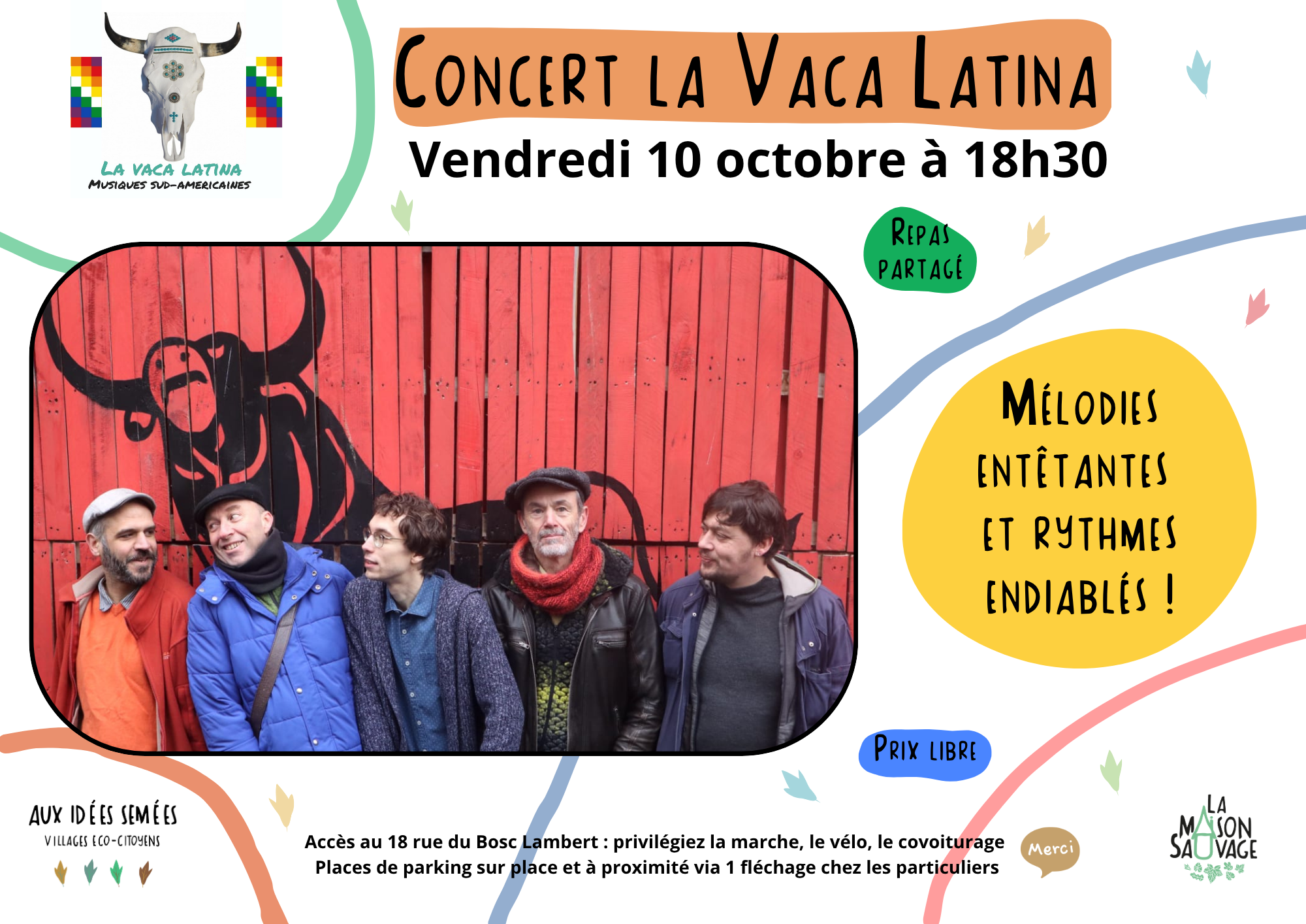 Colombie, Pérou, Bolivie, c’est un voyage musical en Amérique du sud, vers les Andes, que vous propose La Vaca Latina. En espagnol, parfois en quechua, on goûte aux mélodies entêtantes des takiraris et des bailecitos, et on résiste difficilement à l’envie de danser que nous procurent les rythmes endiablés des cumbias et autres landos. L’accordéon et la guitare portent la voix du chanteur, lequel nous raconte des histoires d’amour – souvent tragiques – et des paysages de mer et de montagne, emmené par la richesse des rythmes et des timbres de la percussion. Venez partager l’énergie enjouée des 5 compañeros de La Vaca Latina, et découvrir un répertoire méconnu par chez nous, mais ô combien riche et exaltant !