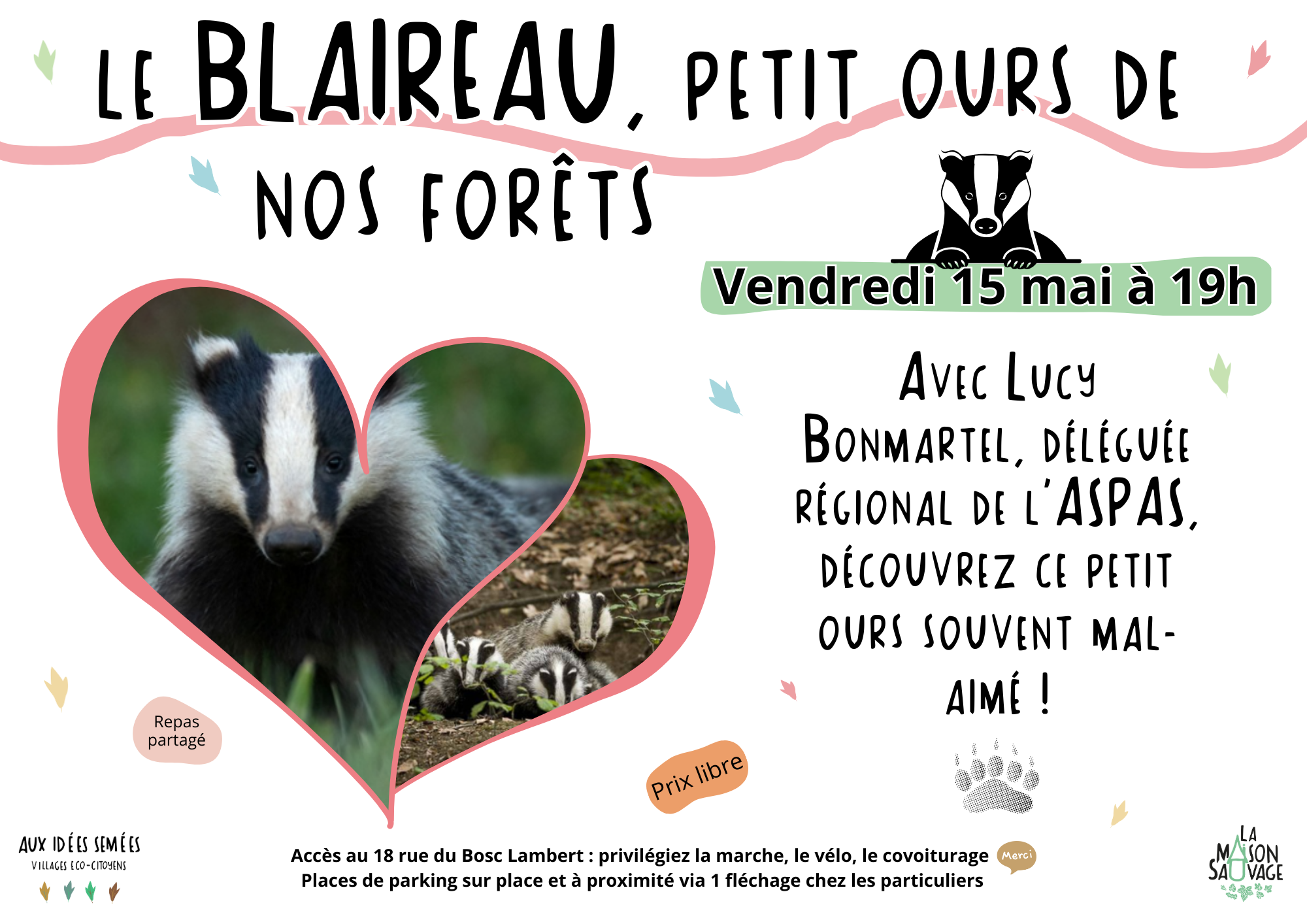 Venez découvrir le blaireau, ce petit ours méconnu de nos forêts, souvent mal-aimé, et pourtant si attachant. Lucy Bonmartel, déléguée régionale de l’Association pour la Protection des Animaux Sauvages, vous révèlera ses mœurs et vous indiquera comment pouvoir l’observer. De plus, le 15 mai se trouve être la Journée Mondiale des Blaireaux ! Alors venez étoffer vos connaissances sur le sujet et, après cette soirée, il y a fort à parier que vous ne traiterez plus jamais quelqu’un de blaireau !