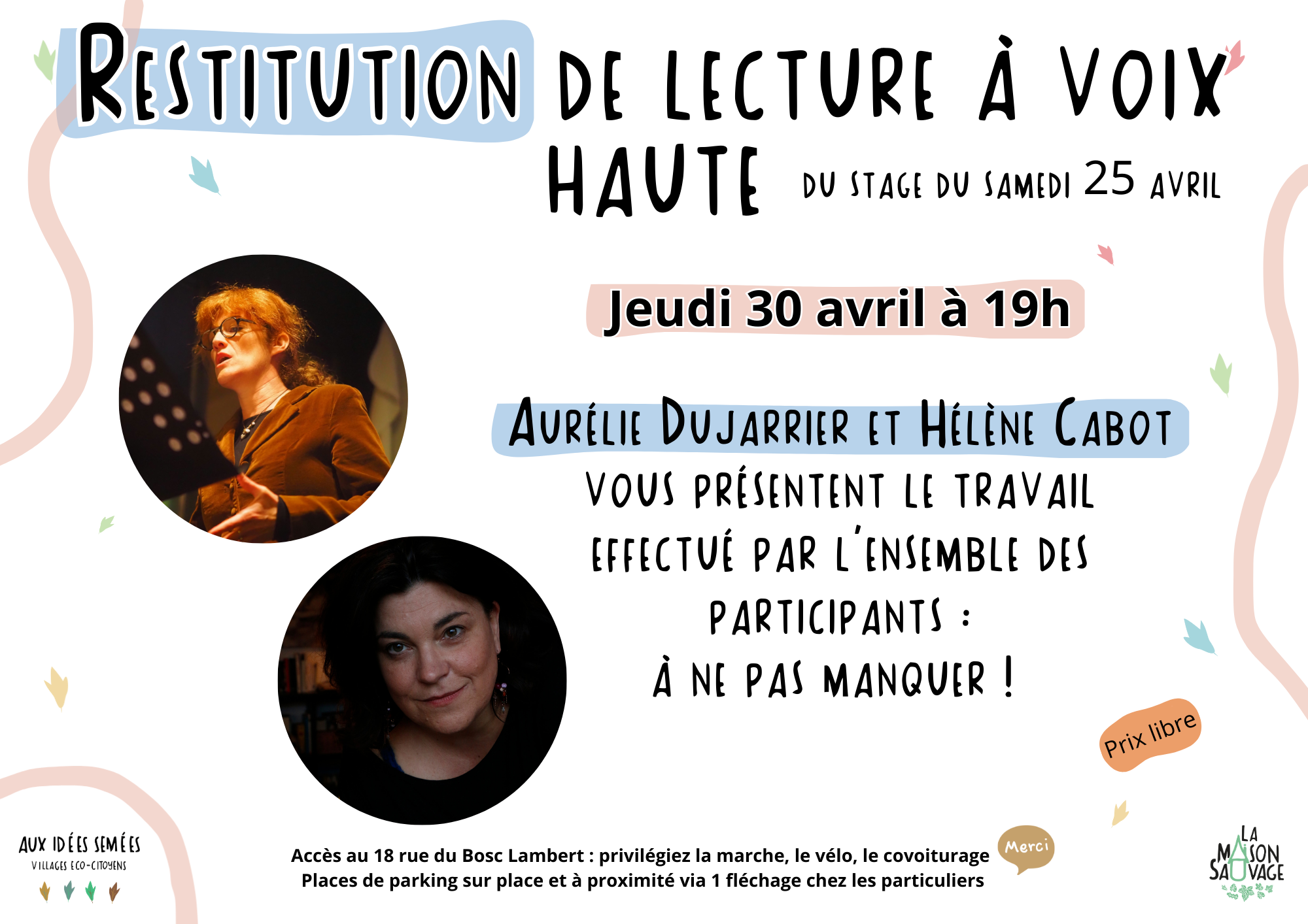 C’est le moment de la restitution : venez écouter des textes soigneusement choisis par Aurélie Dujarrier et Hélène Cabot, à travers la voix de tous les participant.e.s du stage du 25 avril ! Un moment fort où chaque lecteur.rice va donner le meilleur de soi, devant des spectateurs, afin de faire vivre pleinement les émotions qui sortent des mots… Une occasion de découvrir des apprentis conteurs.ses et de donner envie à d’autres de se lancer dans cette aventure humaine qu’est la lecture à voix haute en public ! Venez nombreux !
