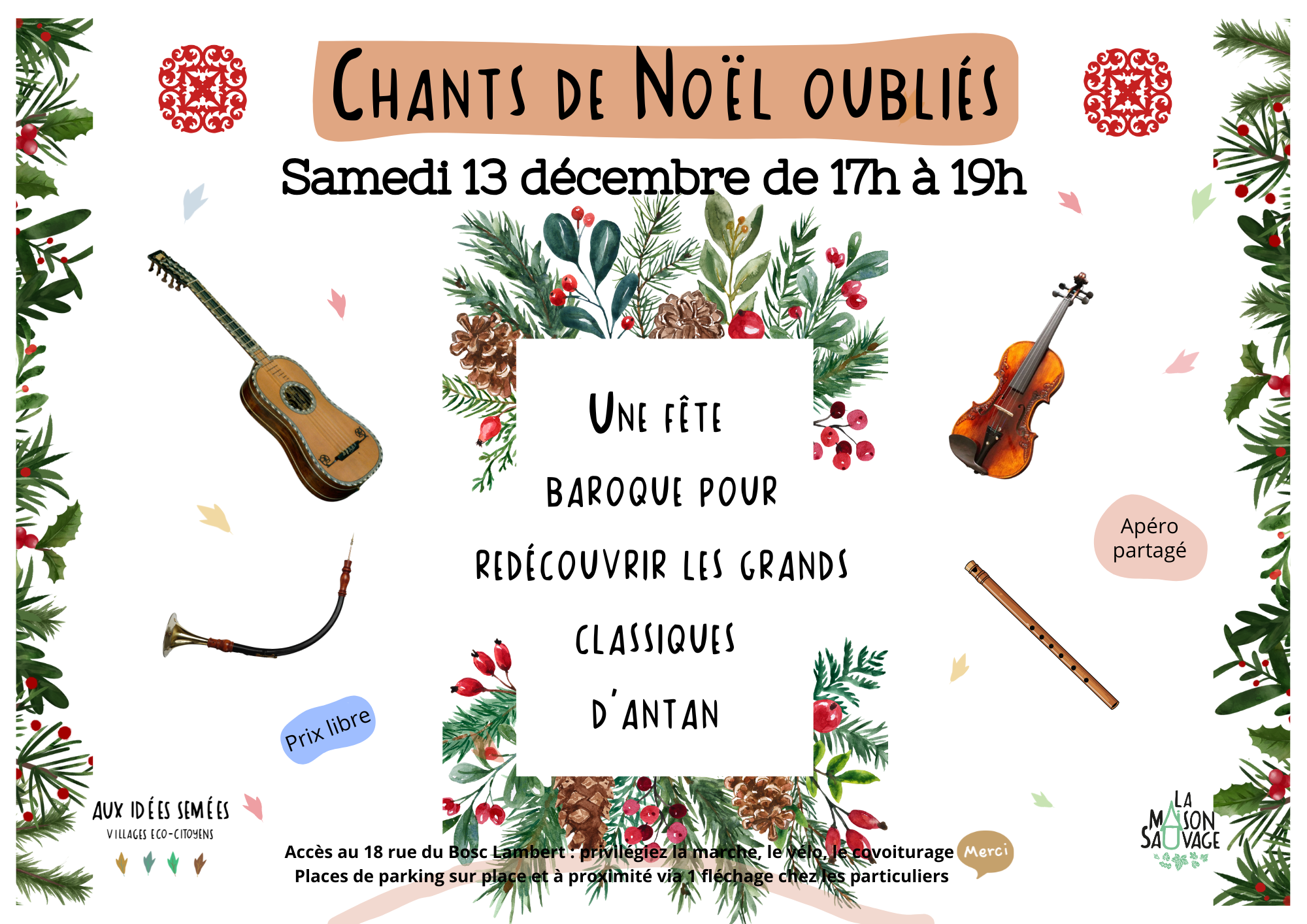 Chants de Noël oubliés Samedi 13 décembre de 17h à 19h En ce 13 décembre, ce trio baroque redonne vie aux Chants de Noël oubliés jadis célébrés en boucle... Et ces mélodies d'antan ne sont pas seules à l'affiche : soyez aussi témoins d'une présentation d'instruments anciens rarissimes ! Venez découvrir, écouter et pourquoi pas...