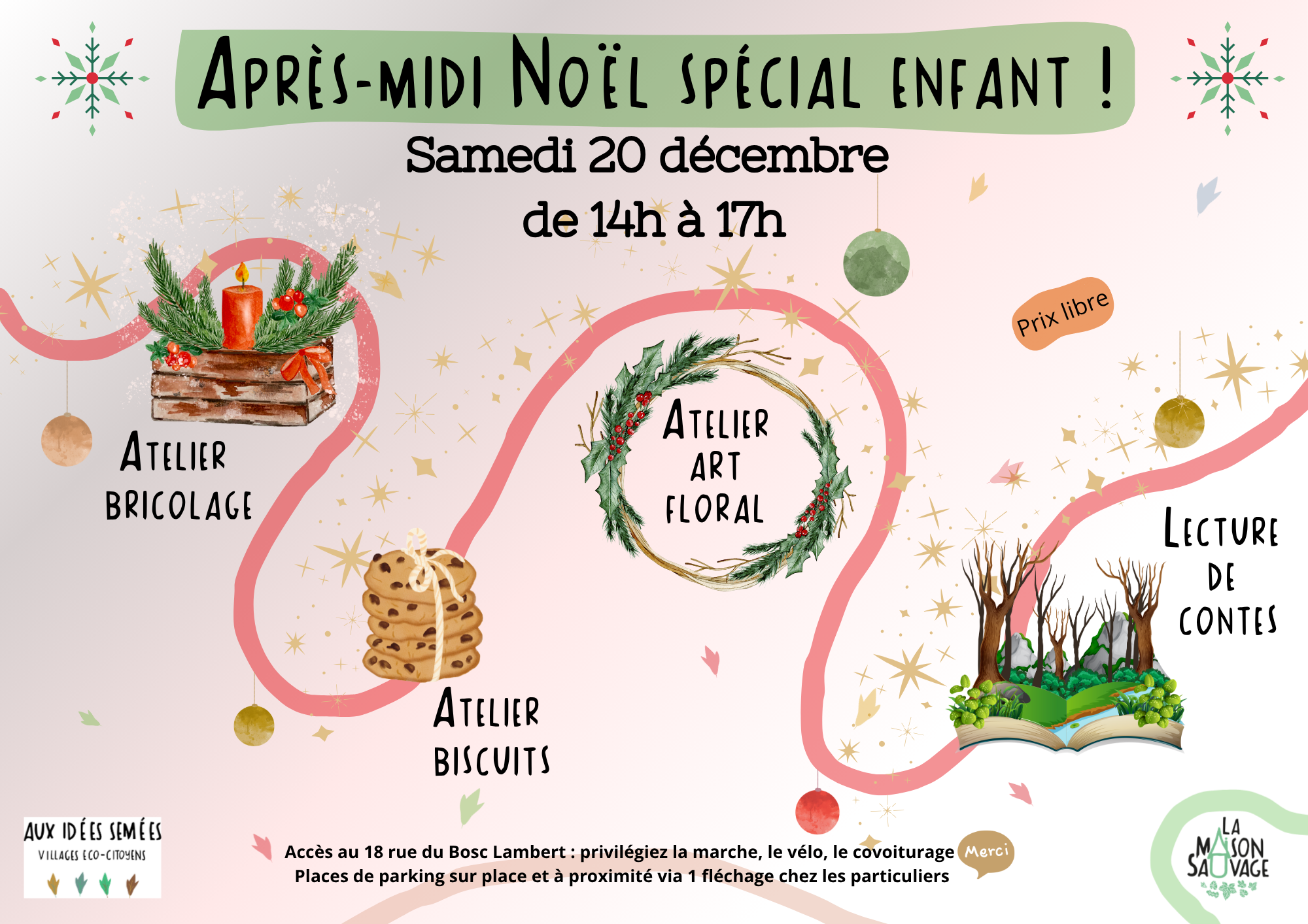 Après-midi enfants spécial Noël Samedi 20 décembre de 14h à 17h Un après-midi consacré aux enfants autour du thème de Noël ! Entre 14h et 17h venez découvrir la Maison Sauvage sous des airs des fête avec : des gourmandises à préparer, des décorations à fabriquer pour embellir ou offrir et des histoires à écouter...