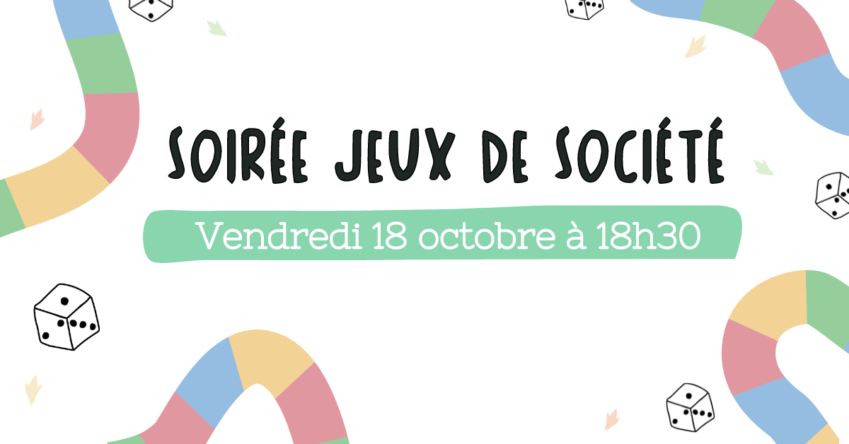 Soirée Jeux de Société Vendredi 18 octobre à 18h30 Vous n'avez jamais passé le cap d'une soirée jeux? Alors c'est le moment! Thomas et ses ados animeront les tables avec entrain et bonne humeur! Des jeux pour tous les âges et tous les goûts, par équipe ou non, avec défi ou pas ... on est...