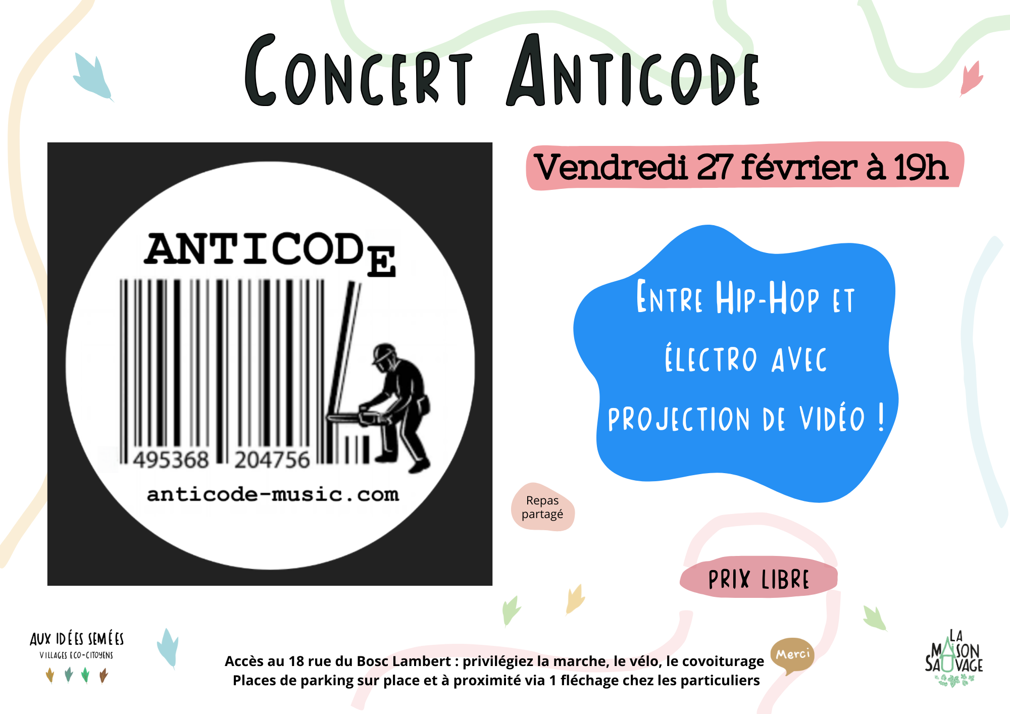 La Maison Sauvage 18 rue du bosc lambert, Hauville, FranceConcert Anticode Vendredi 27 février à 19h Anticode c'est l'histoire de 2 copains qui mixent depuis longtemps et qui décidé de tenter l'aventure des concerts ! Ca donne un duo...