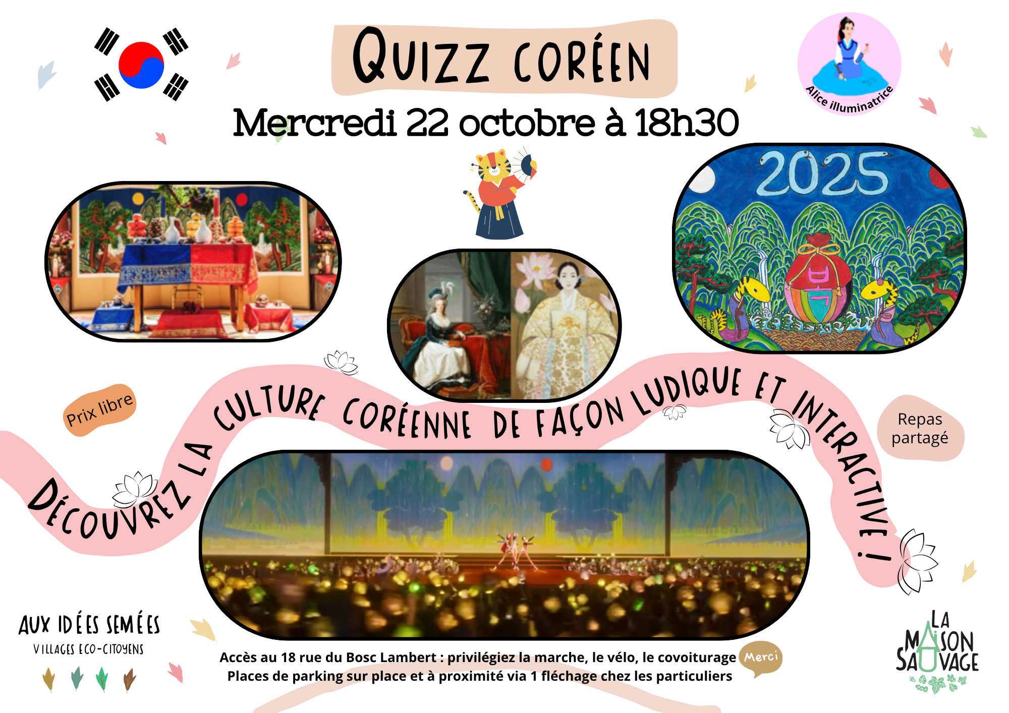 Quizz coréen Mercredi 22 octobre à 18h30 Connaissez-vous la culture coréenne ? Si oui, venez tester vos connaissances avec Min Jee dont c'est le berceau ! Avez-vous vu les films "Parasite", "Squid Game" ou encore "K-pop Demon Hunters" ? Quand vous aurez compris pourquoi les réalisateurs les ont ainsi imaginés, ils s'éclaireront alors d'un jour...
