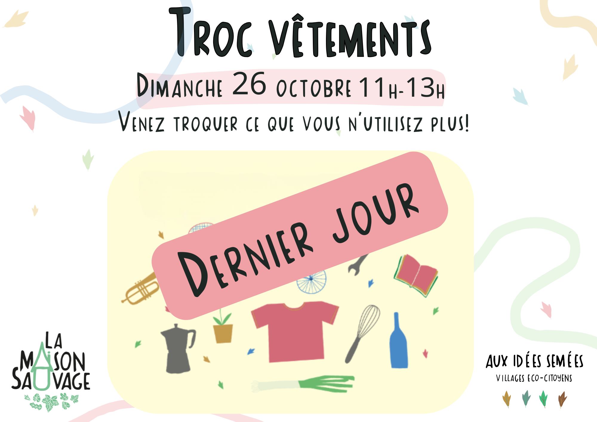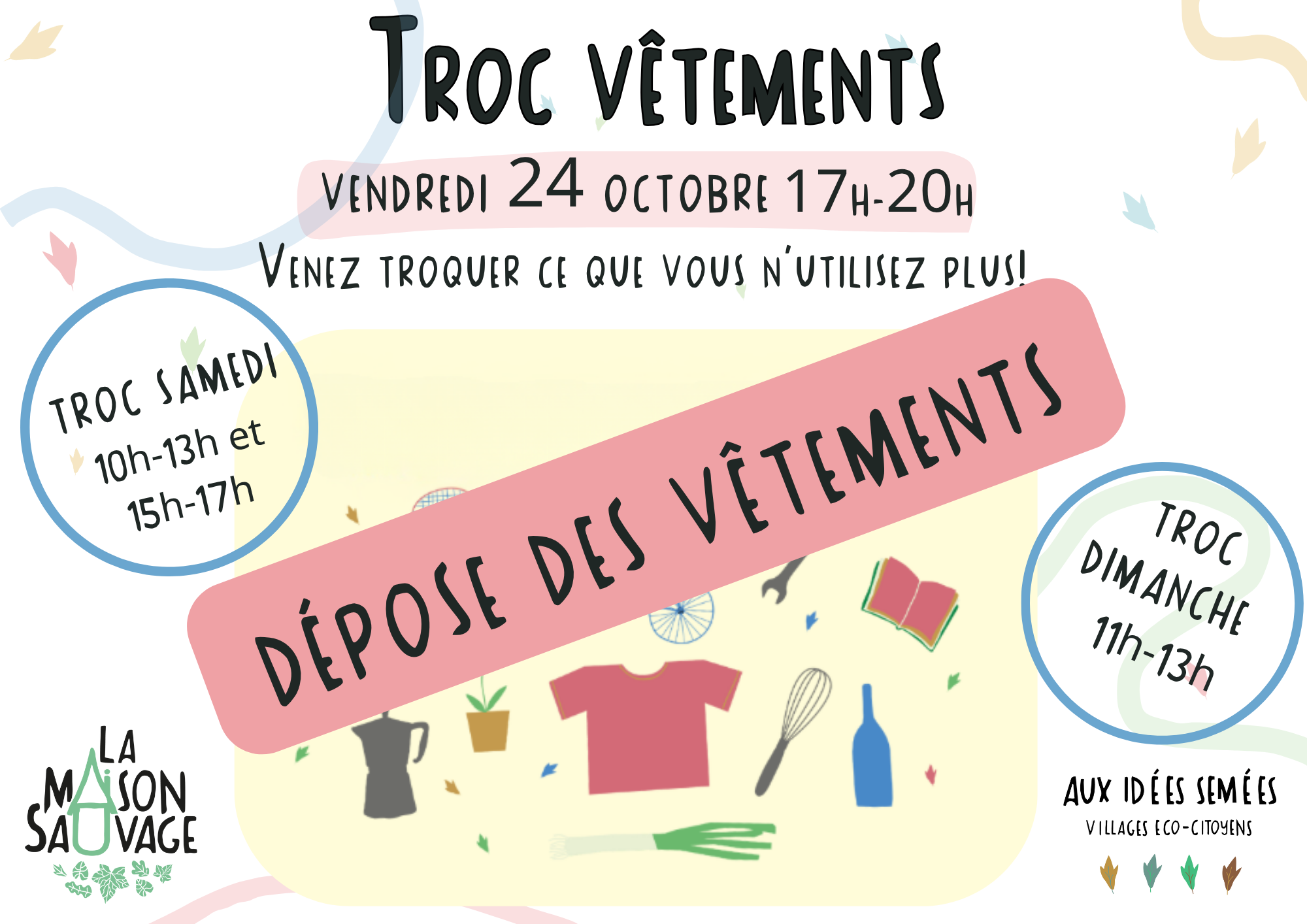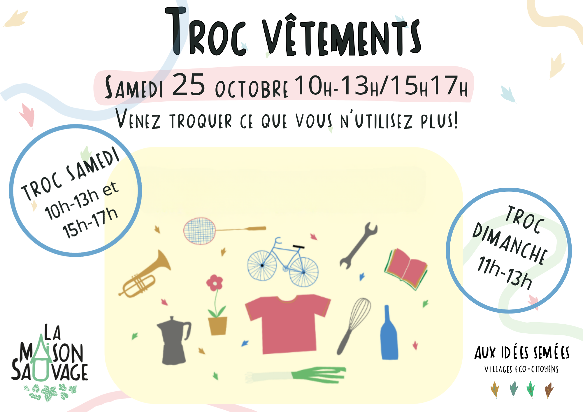 Troc vêtements samedi 25 octobre 10h-13h et 15h-17h & dimanche 26 octobre 11h-13h Le troc vêtements REVIENT !!! Le retour de l'automne invite à faire le tri dans nos armoires :-) Venez troquer des pièces que vous n'utilisez plus pour leur permettre de revivre sur le dos de quelqu'un d'autre! Le principe est simple :...