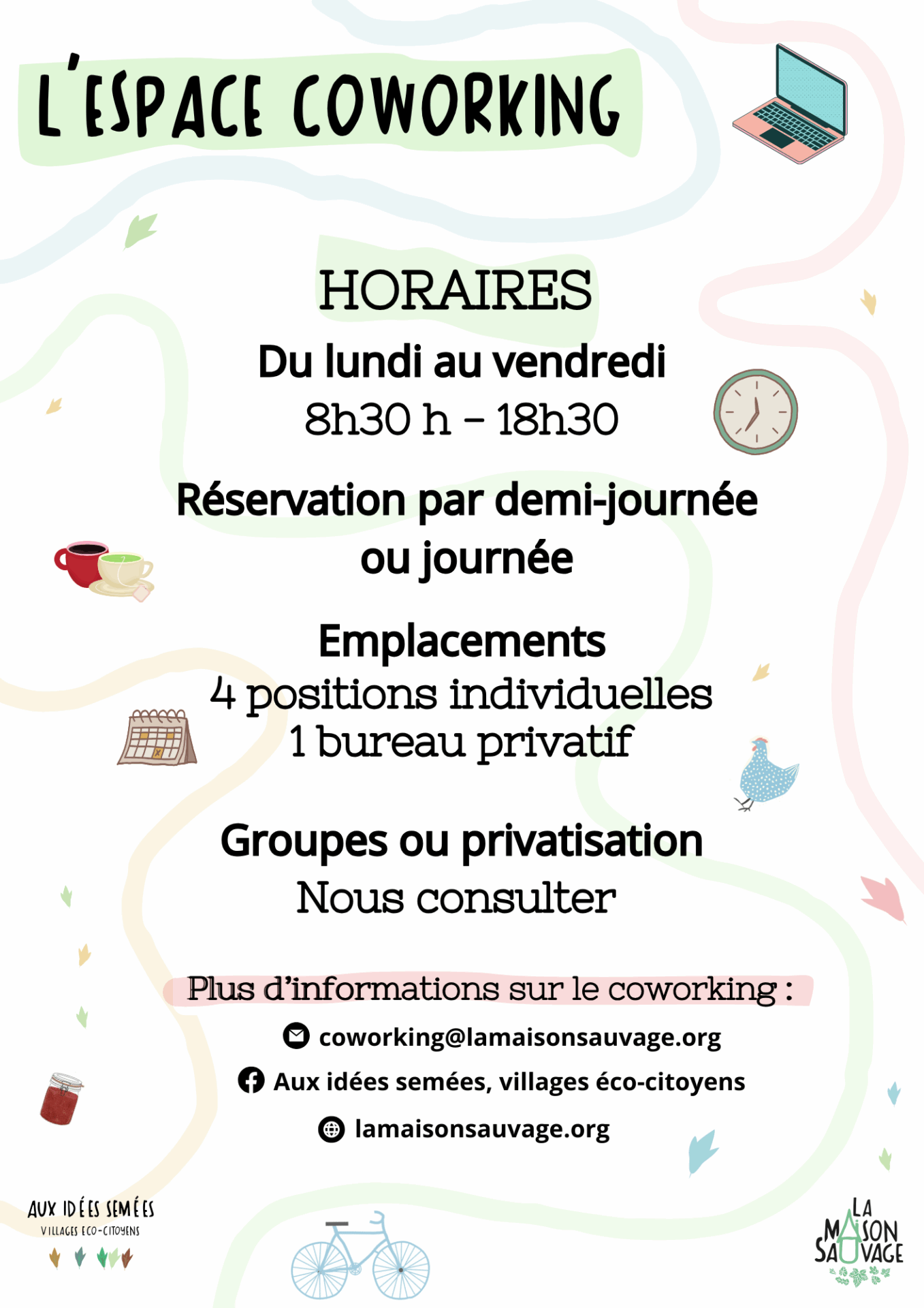 Pour en savoir plus et connaître nos conditions d’accès et modèles tarifaires, nous vous invitons à nous contacter sur le mail : coworking@lamaisonsauvage.org