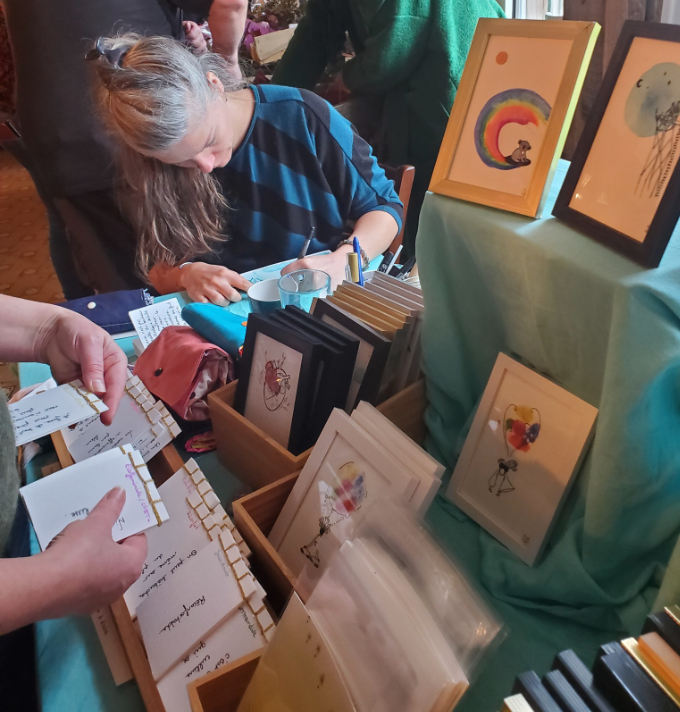 Il y a avait du monde au marché artisanal de la Maison Sauvage ce dimanche 14 décembre ! Certain.e.s ont pu exposer leurs talents et ainsi proposer une multitude de belles choses à commencer par les couturières qui avaient confectionné de nombreuses créations ! Céline n’était pas en reste avec ses accessoires et décorations réalisés à partir d’objets recyclés, Danielle avait un très joli stand de bijoux qu’elle réalise à la main, Martin et son envolée d’oiseaux ainsi que son présentoir de porte-clés a enchanté tout le monde, Luce nous a conquis.e.s avec ses aquarelles poétiques et Claire-Marie a permis d’embellir l’espace avec l’atelier art floral ! Une matinée pleine de joie et de partage alors … à l’année prochaine !
